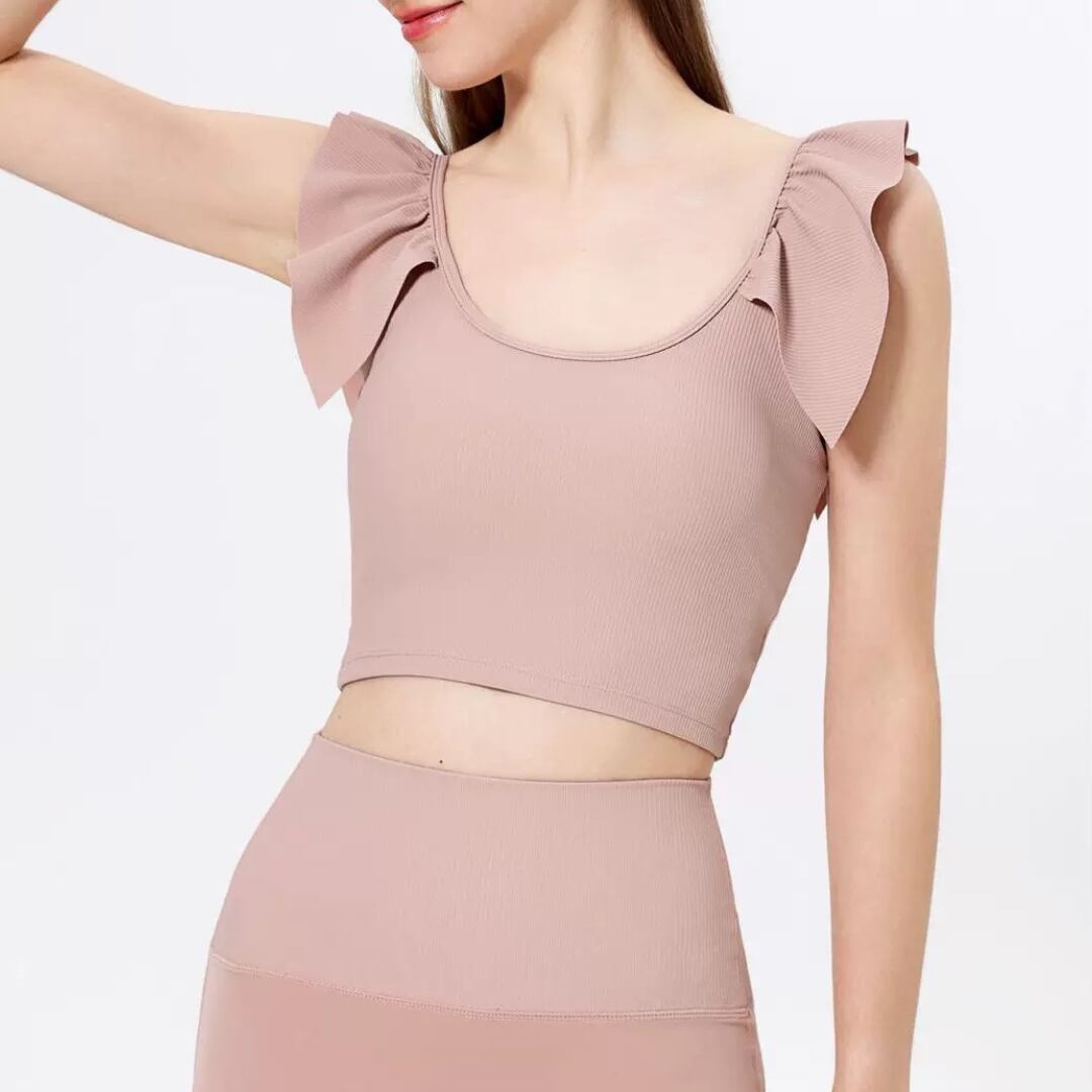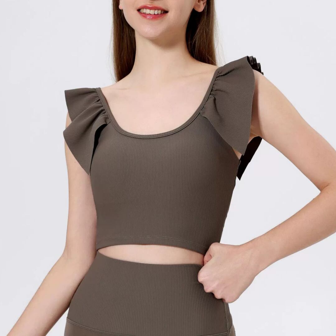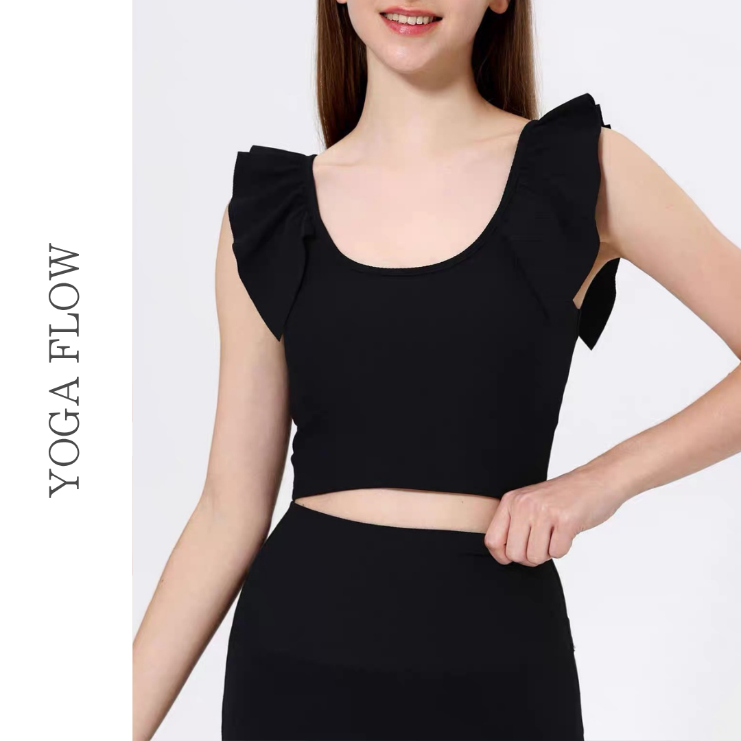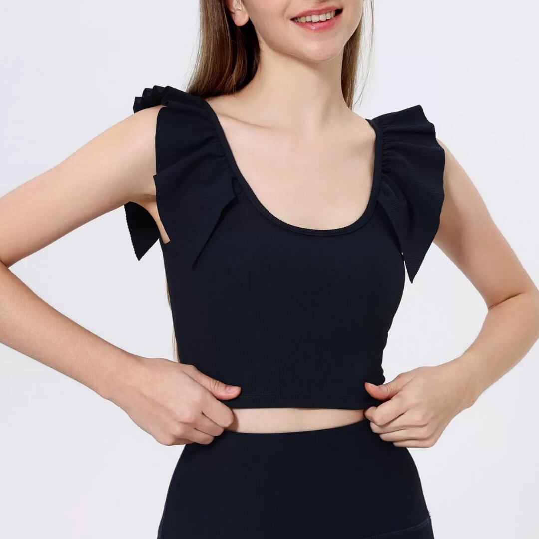 【商品管理番号】 F0106 【商品説明】 肩のフリルデザインが華やかなクロップドトップ。 伸縮性のある快適な素材で動きやすく、シルエットもきれいに見せてくれます。 ハイウエストボトムとの相性が良く、アクティブシーンから普段使いまで幅広く活躍。 【サイズ】 【S】バスト:72cm/着丈:21.5cm/ウエスト:62cm 【M】バスト:76cm/着丈:22.5cm/ウエスト:66cm 【L】バスト:80cm/着丈:23.5cm/ウエスト:70cm 【XL】バスト:84cm/着丈:24.5cm/ウエスト:74cm 【カラー】 ブラック ホワイト ネイビーブルー ピンク カーキ 【素材】 ナイロン80%/ポリウレタン20%