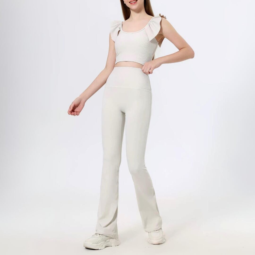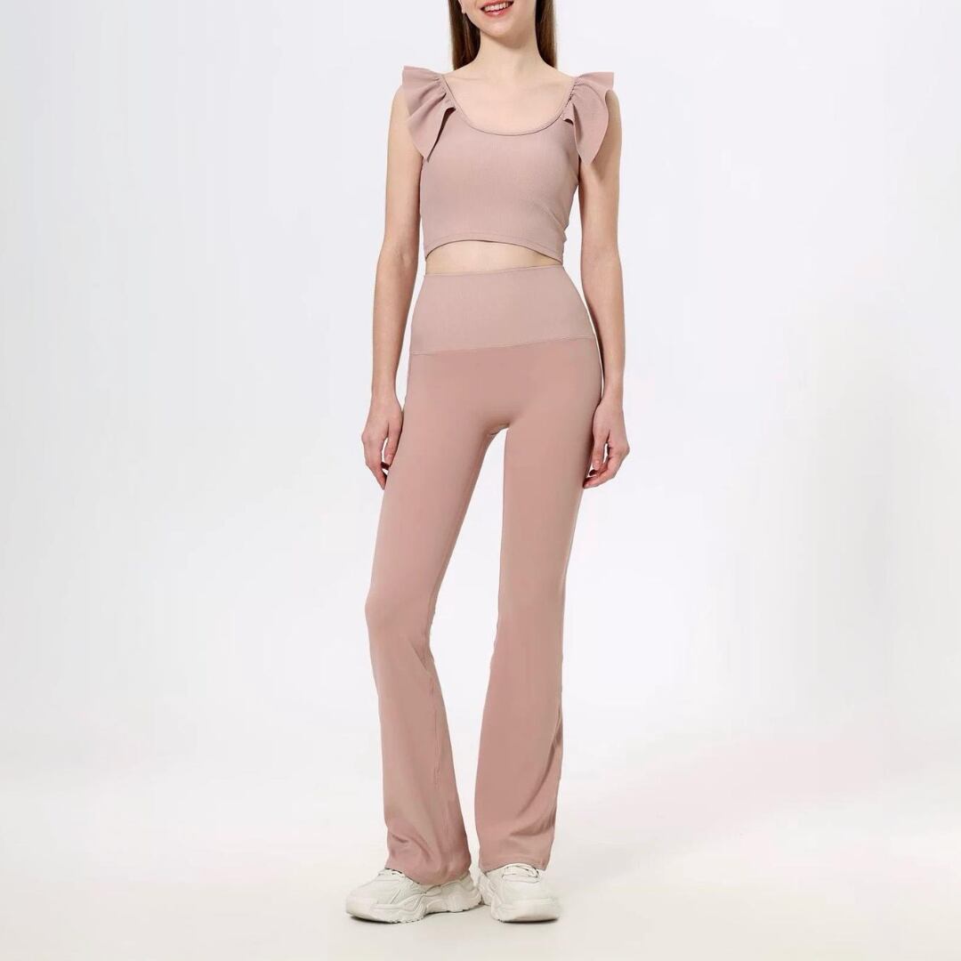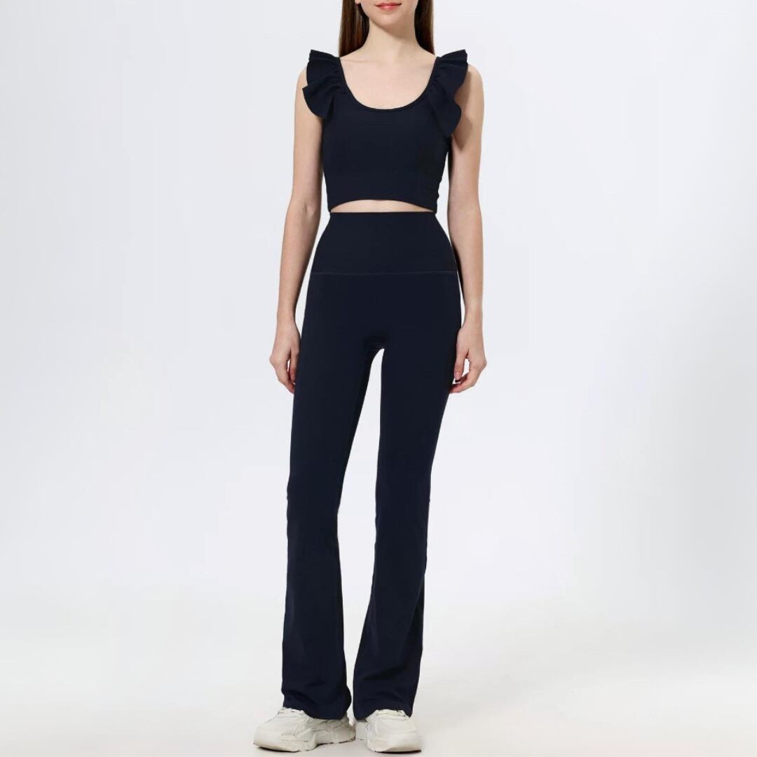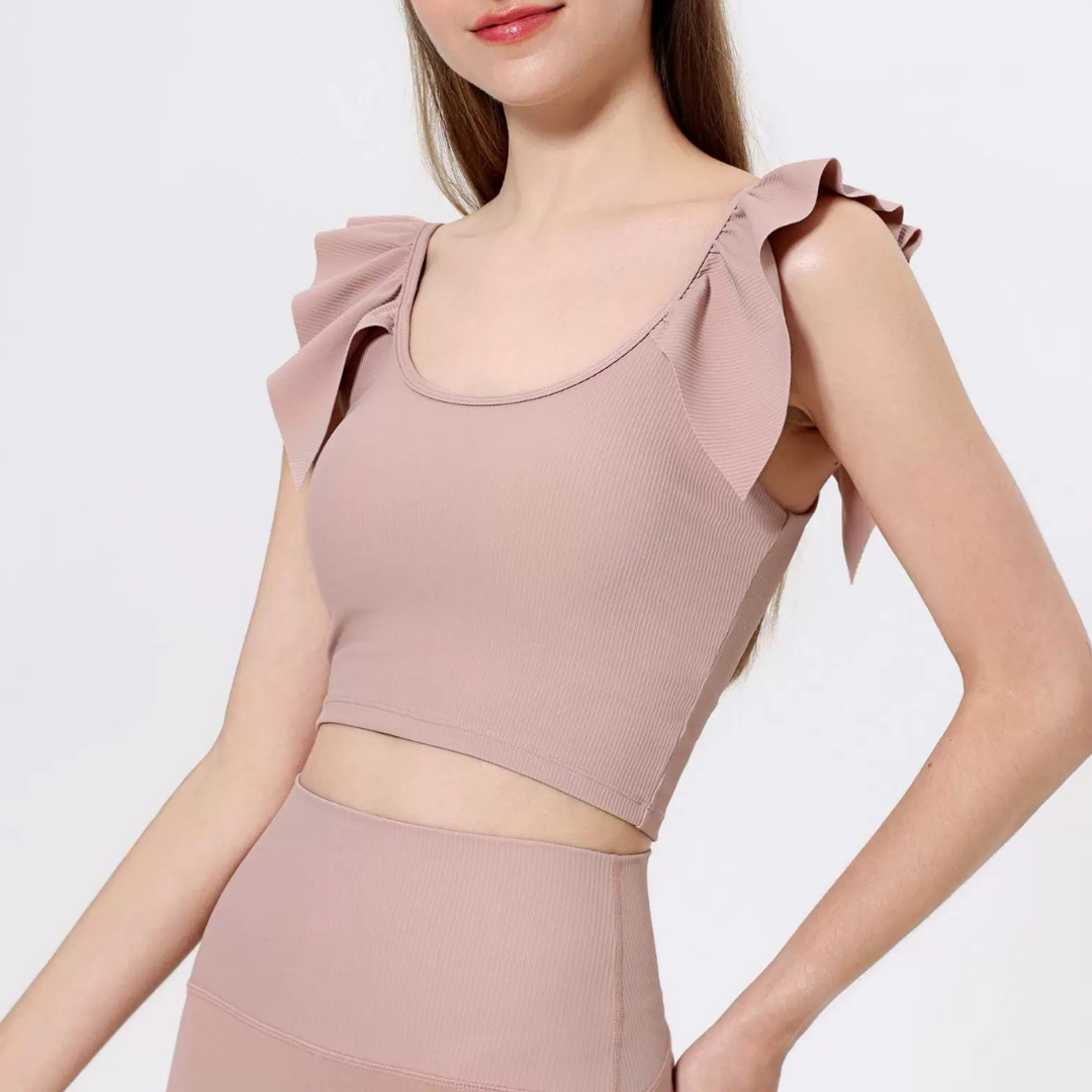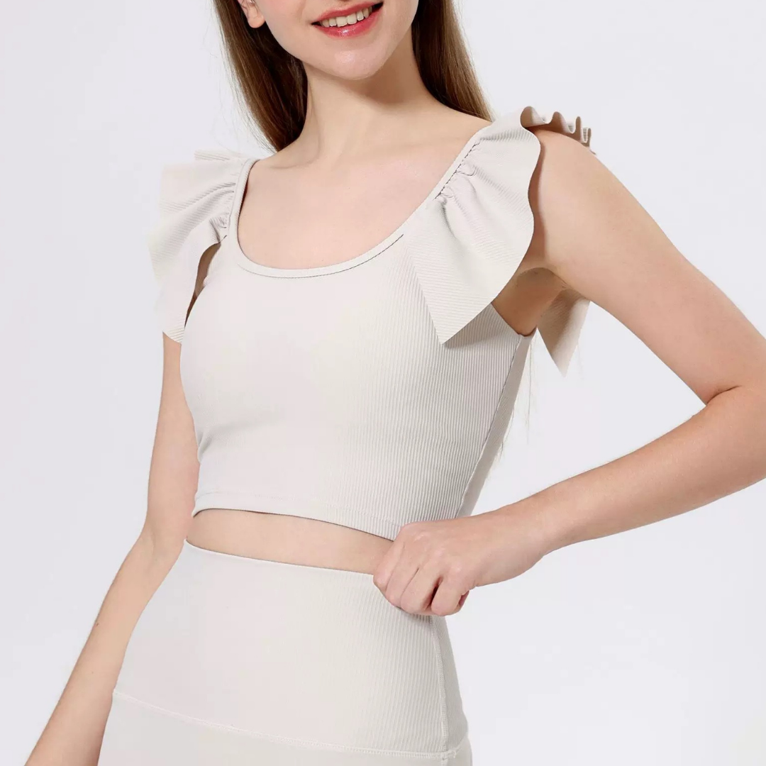 【商品管理番号】 F0106 【商品説明】 肩のフリルデザインが華やかなクロップドトップ。 伸縮性のある快適な素材で動きやすく、シルエットもきれいに見せてくれます。 ハイウエストボトムとの相性が良く、アクティブシーンから普段使いまで幅広く活躍。 【サイズ】 【S】バスト:72cm/着丈:21.5cm/ウエスト:62cm 【M】バスト:76cm/着丈:22.5cm/ウエスト:66cm 【L】バスト:80cm/着丈:23.5cm/ウエスト:70cm 【XL】バスト:84cm/着丈:24.5cm/ウエスト:74cm 【カラー】 ブラック ホワイト ネイビーブルー ピンク カーキ 【素材】 ナイロン80%/ポリウレタン20%