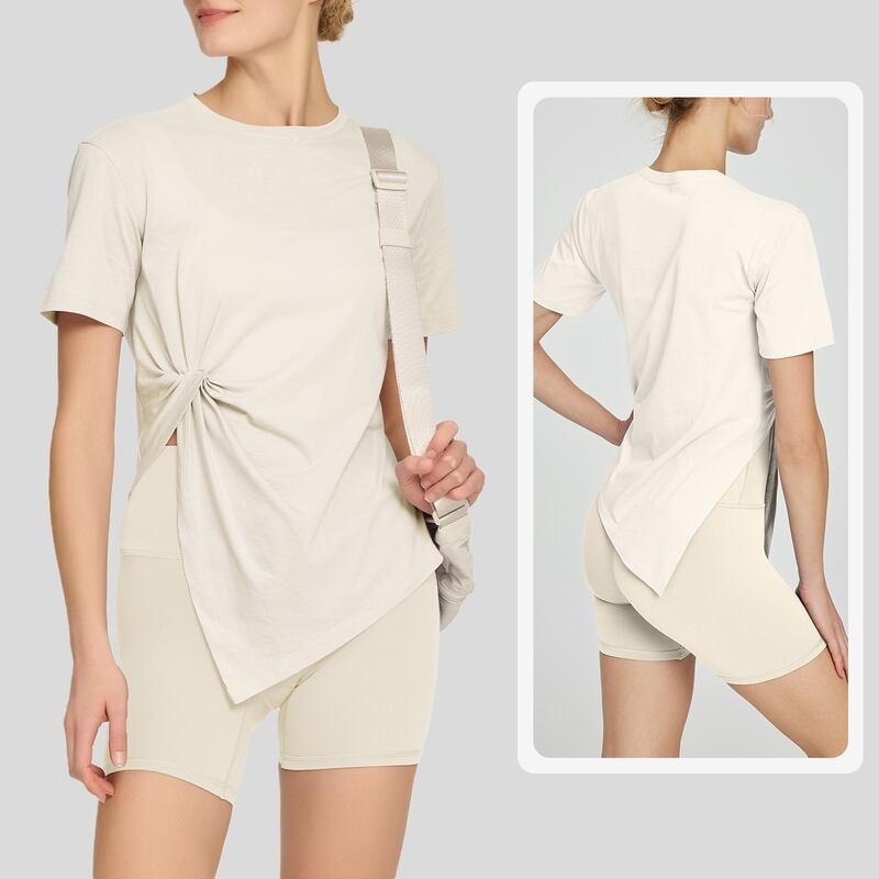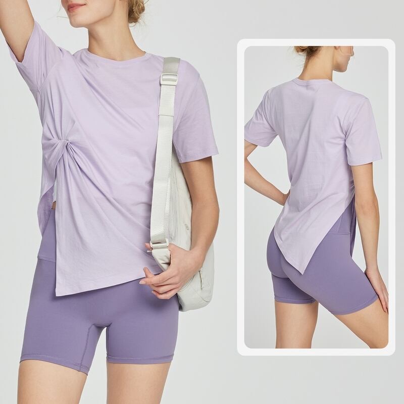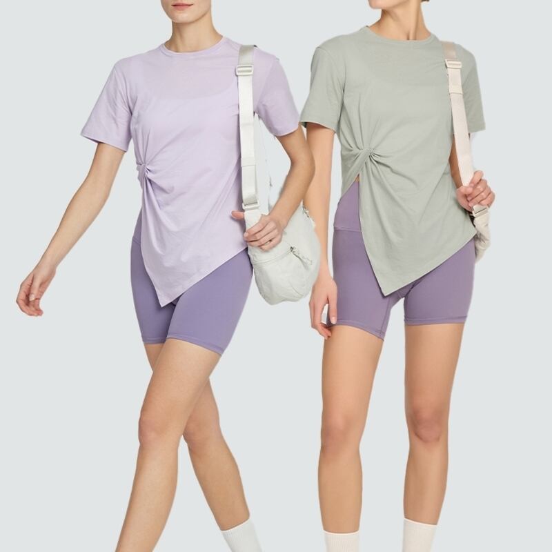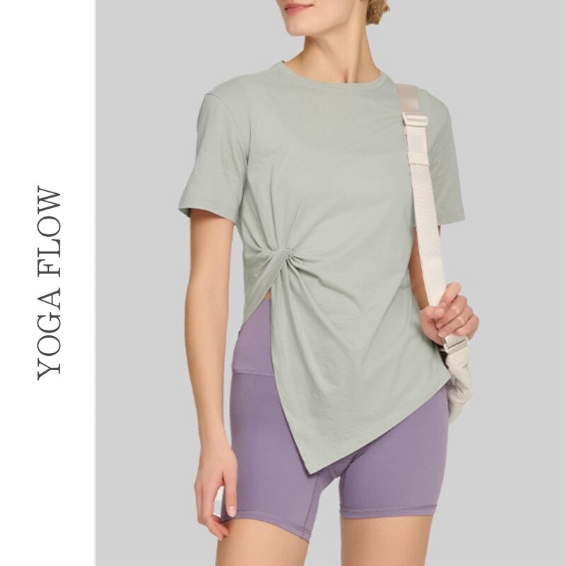 【商品管理番号】 F0041 【商品説明】 裾にノットをあしらいふんわりとした立体的なシルエットを演出するアシンメトリーTシャツです。ハイウエストにアクセントを置き、スポーツシーンから日常のお出かけまで、さまざまなシチュエーションにマッチします。ベーシックながら個性的なデザインが着回しやすく、あなたのアクティブライフをサポートします! 【サイズ】 【S】バスト:88cm/裾まわり:81.6cm/着丈:66cm 【M】バスト:92cm/裾まわり:85.6cm/着丈:67cm 【L】バスト:96cm/裾まわり:89.6cm/着丈:68cm 【カラー】 ホワイト パープル ブラック グレーグリーン 【素材】 コットン100%
