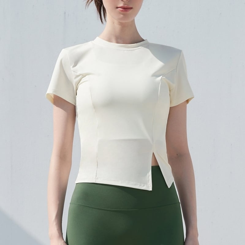 【商品管理番号】 F0044 【商品説明】 アシンメトリーな裾のスリットがアクセントになったタイトなショート丈Tシャツです。短めでミニマルなデザインは動きやすさを追求し、スポーツシーンから日常のお出かけまで、さまざまなシチュエーションにマッチします。シンプルなデザインが魅力的で、あなたのアクティブライフをサポートします! 【サイズ】 【S】バスト:36.5cm/袖丈:14cm/着丈:47cm 【M】バスト:38.5cm/袖丈:14cm/着丈:49cm 【L】バスト:40.5cm/袖丈:14cm/着丈:51cm 【XL】バスト:42.5cm/袖丈:14cm/着丈:53cm 【カラー】 ライトブルー ライトイエロー 【素材】 ナイロン80%/ポリウレタン20%