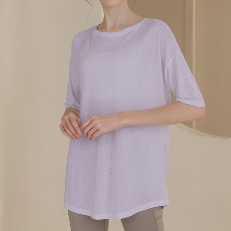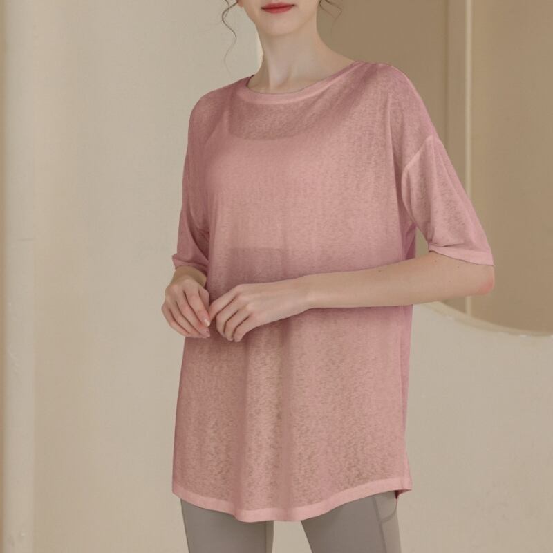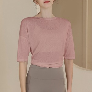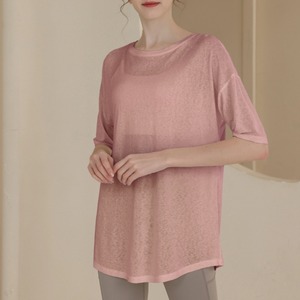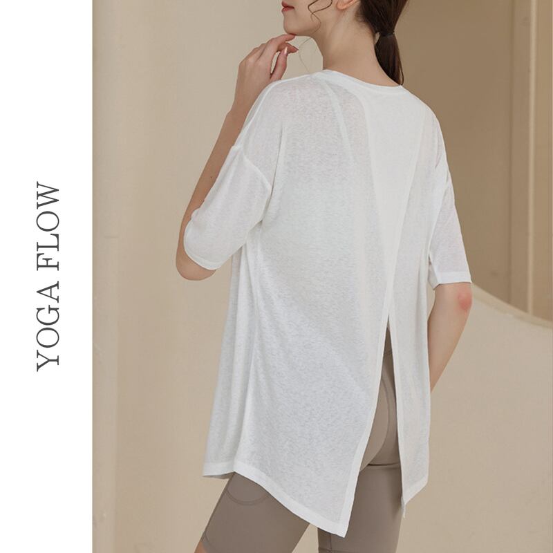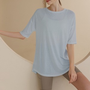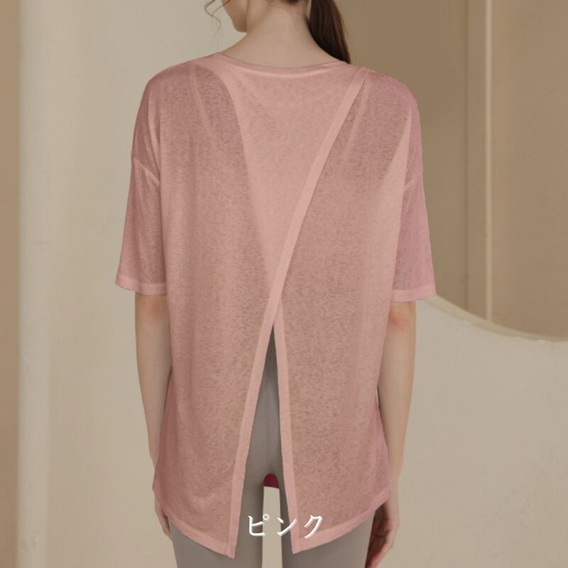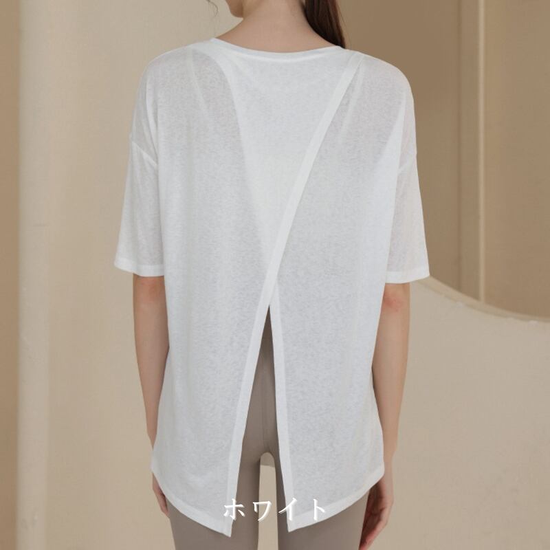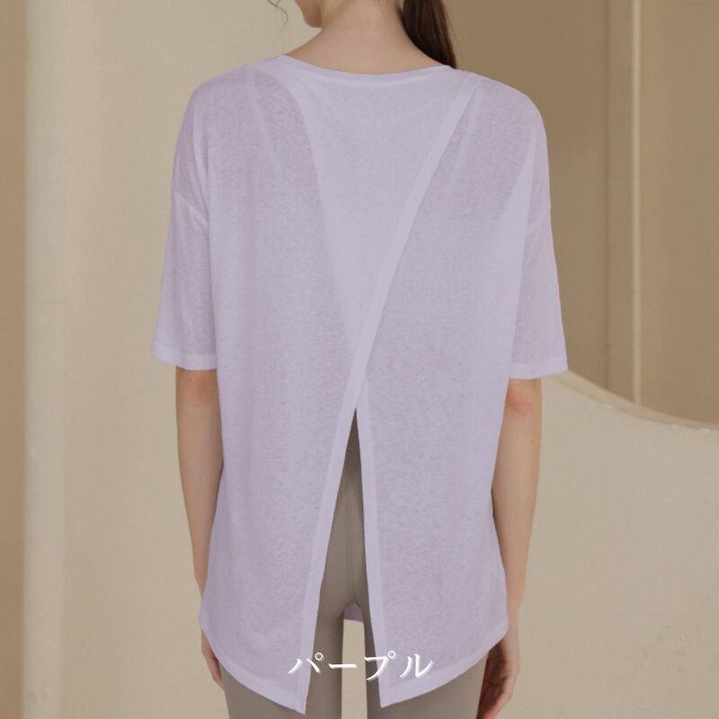 【商品管理番号】 F0046 【商品説明】 ノットにしてアレンジを楽しめるバックデザインが特徴のTシャツです。トレンドを取り入れつつ、こなれた印象を与える一着となっており、スポーツシーンから日常のお出かけまで、さまざまなシチュエーションにマッチします。シンプルなデザインが着回しやすく、あなたのアクティブライフをサポートします! 【サイズ】 【S】バスト:106cm/着丈:65cm 【M】バスト:110cm/着丈:66cm 【L】バスト:114cm/着丈:67cm 【カラー】 ホワイト グリーン パープル ブルー ピンク ブラック 【素材】 レーヨン70%/ポリエステル30%