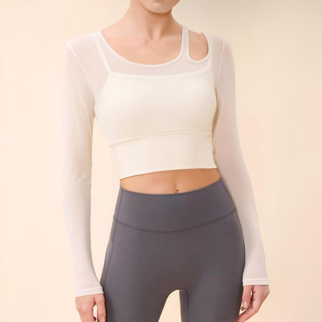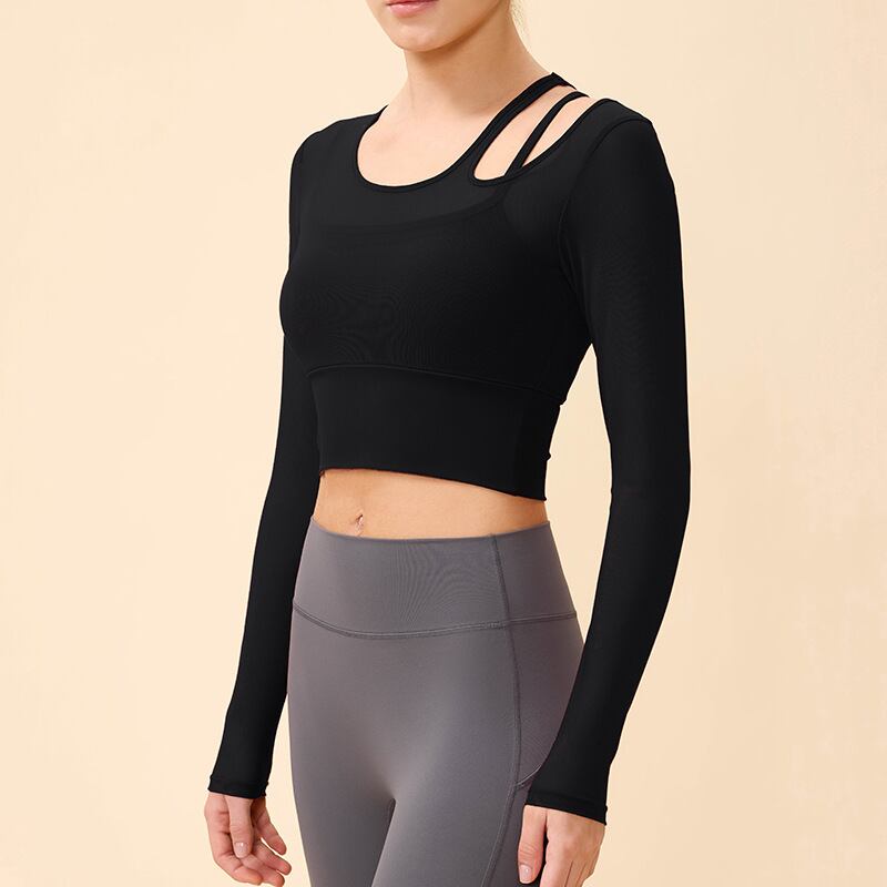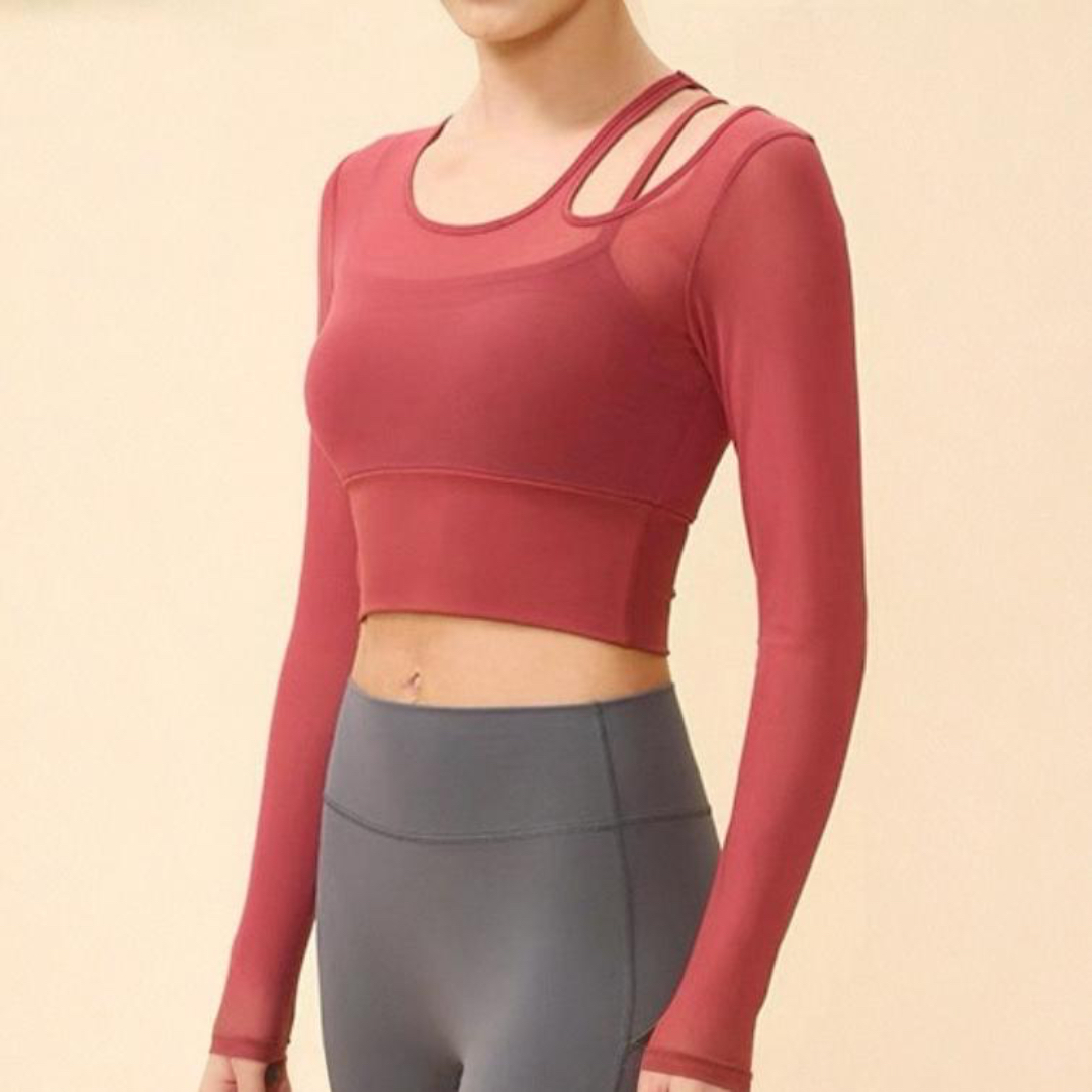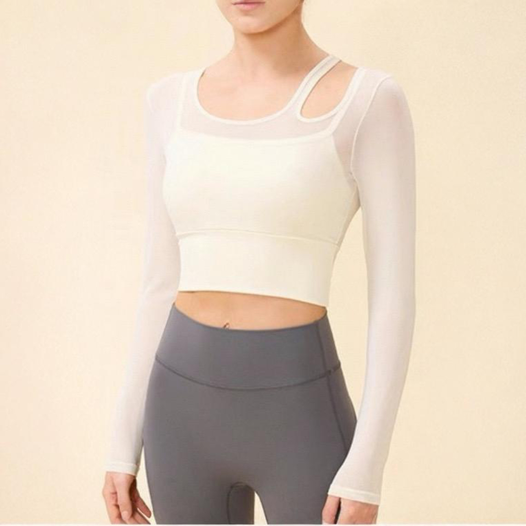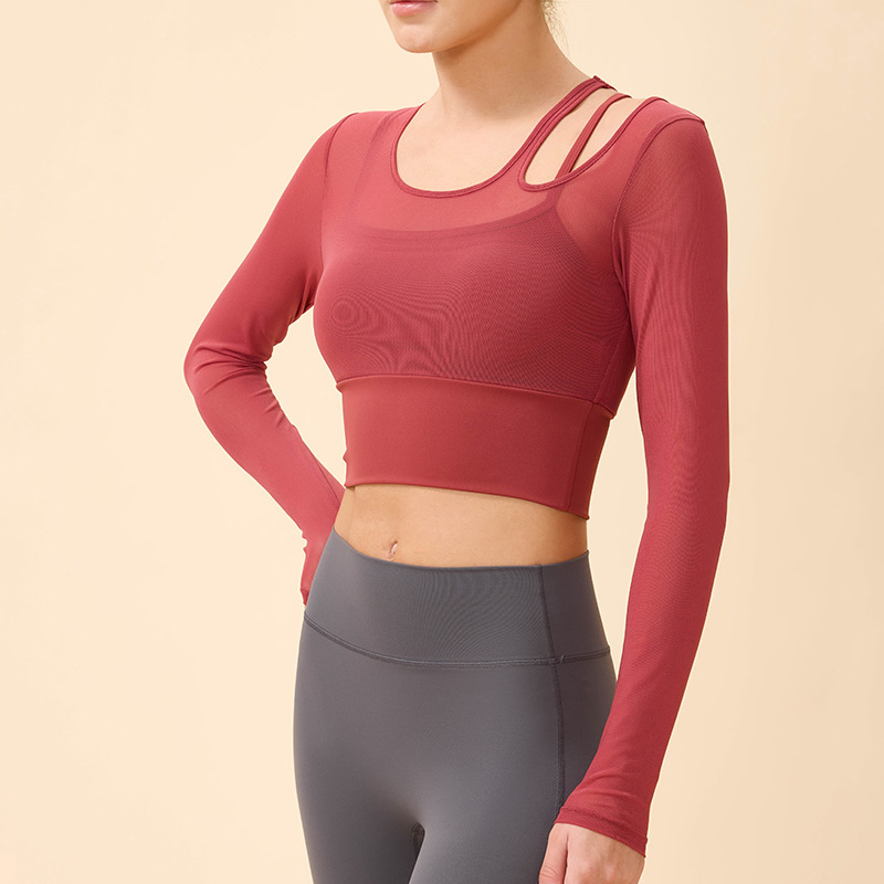 【商品管理番号】 F0119 【商品説明】 肩のストラップとメッシュ切り替えがポイントのロングスリーブトップスです。 程よく体にフィットし、ヨガやピラティスの動きをスムーズにサポートします。 スタジオでも日常でもバランスよく着られるデザインです。 【サイズ】 【S】バスト:70cm/袖丈:58cm/裾まわり:58cm/着丈:37cm 【M】バスト:74cm/袖丈:59cm/裾まわり:62cm/着丈:38cm 【L】バスト:78cm/袖丈:60cm/裾まわり:66cm/着丈:39cm 【カラー】 アイボリー レッド ブルー グリーン ブラック 【素材】 (本体)ナイロン81%/ポリウレタン19% (メッシュ部分)ナイロン95%/ポリウレタン5%