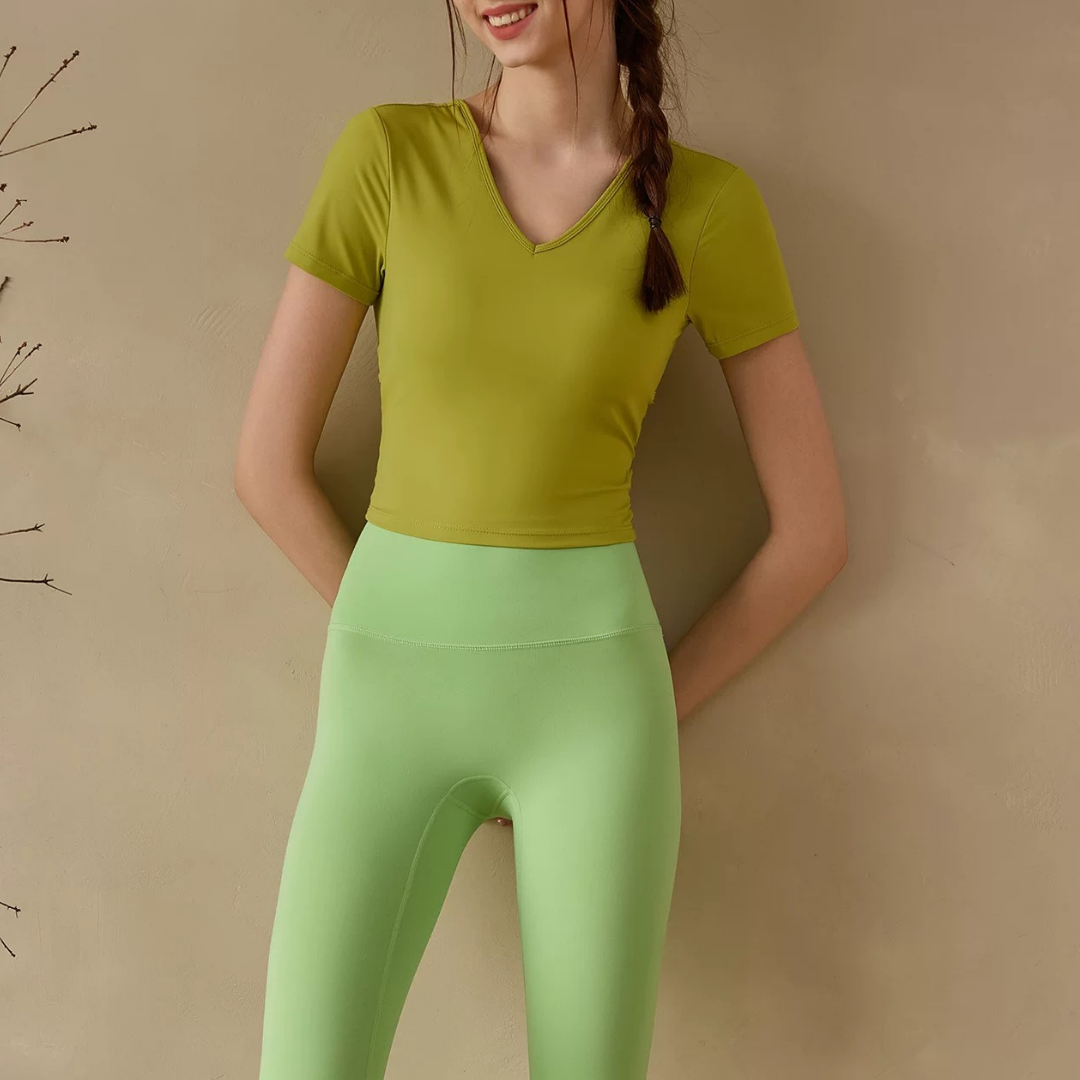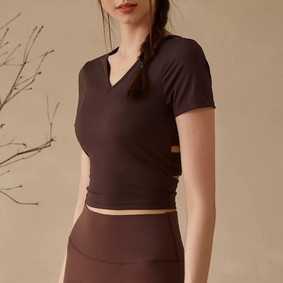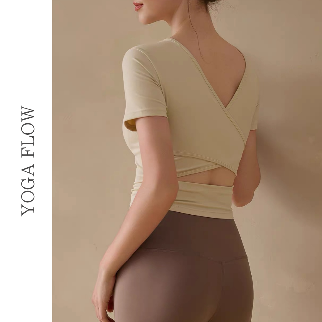 【商品管理番号】 F0126 【商品説明】 背中のクロスデザインが印象的なショート丈Tシャツです。 滑らかで伸びのあるナイロン素材が動きにフィットし、ヨガやワークアウトにもぴったりです。 程よいVネックで首元をすっきり見せ、女性らしいシルエットを引き立てます。 【サイズ】 【S】バスト:31/38cm/着丈:46cm 【M】バスト:33/40cm/着丈:47cm 【L】バスト:35/42cm/着丈:49cm 【XL】バスト:37/44cm/着丈:50cm 【カラー】 ベージュ ブルー パープル グリーン ブラウン 【素材】 ナイロン75%/スパンデックス25%