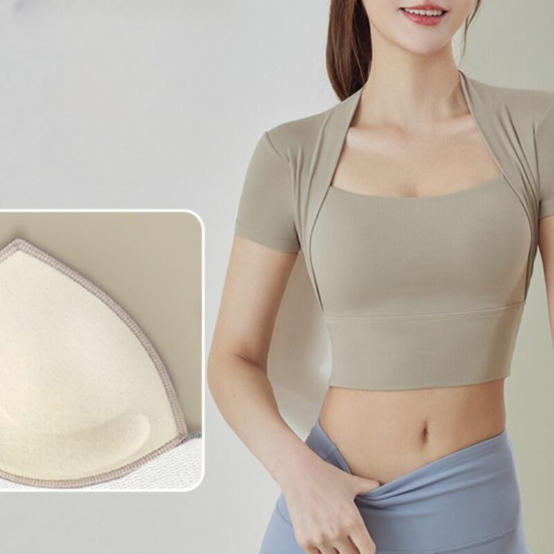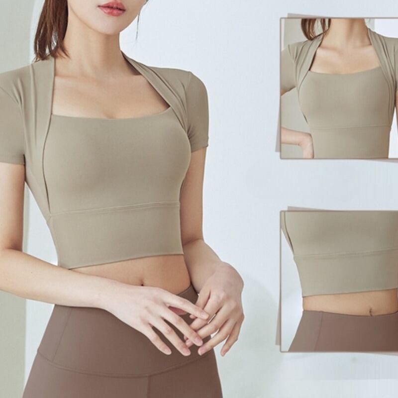 【商品管理番号】 F0058 【商品説明】 ボレロを重ねたようなスクエアネックデザインが印象的なショート丈Tシャツです。スリムなフィット感が動きやすさを追求し、スポーツシーンから日常のお出かけまで、さまざまなシチュエーションにマッチします。抜群の着心地で、あなたのアクティブライフをサポートします! 【サイズ】 【S】バスト:70cm/アンダーバスト:56cm/着丈:34cm 【M】バスト:74cm/アンダーバスト:60cm/着丈:35cm 【L】バスト:78cm/アンダーバスト:64cm/着丈:36cm 【XL】バスト:82cm/アンダーバスト:68cm/着丈:37cm 【カラー】 グリーン ブラック ベージュ 【素材】 ナイロン85%/ポリウレタン15%