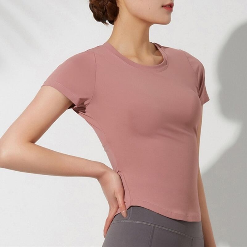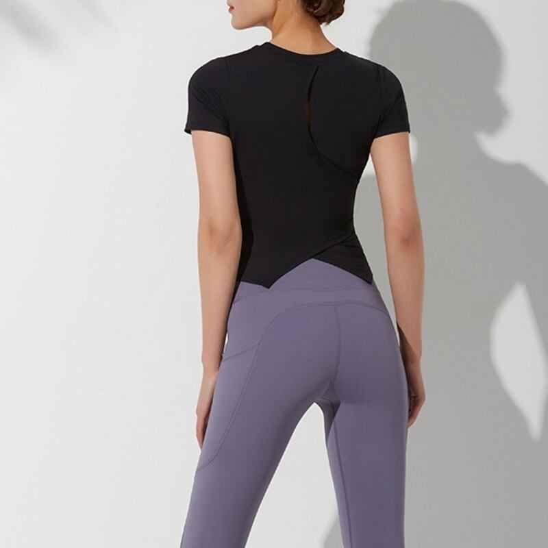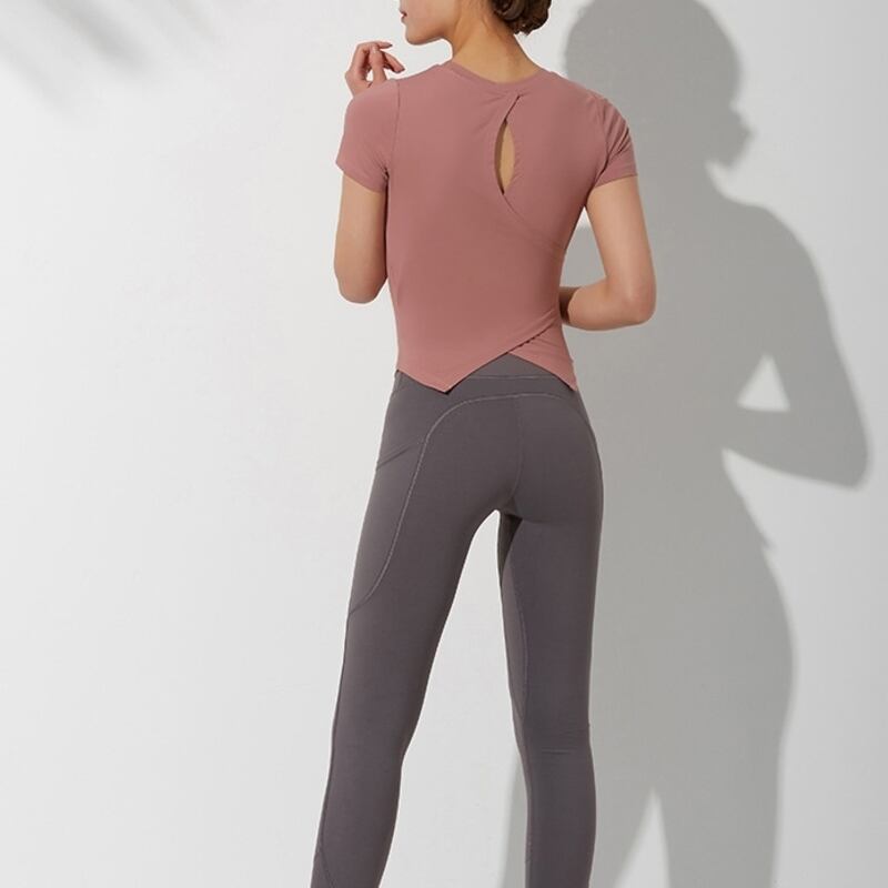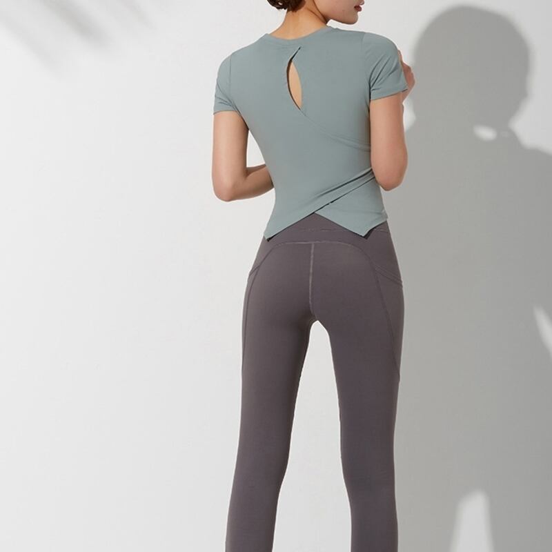 【商品管理番号】 F0063 【商品説明】 バッククロスとさり気ないオープンデザインが特徴の、セクシーなスリムTシャツです。短めでミニマルなデザインは動きやすさを追求し、スポーツシーンから日常のお出かけまで、さまざまなシチュエーションにマッチします。シンプルなこなれ感で、あなたのアクティブライフをサポートします! 【サイズ】 【S】バスト:38.5cm/着丈:51cm 【M】バスト:40.5cm/着丈:52cm 【L】バスト:42.5cm/着丈:53cm 【カラー】 グリーン ピンク ネイビー ブラック ライトグレー 【素材】 ナイロン87%/ポリウレタン13%
