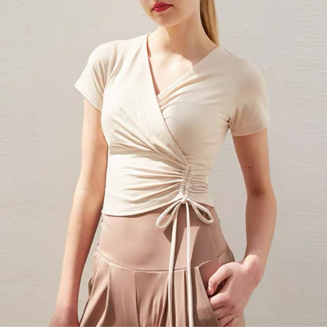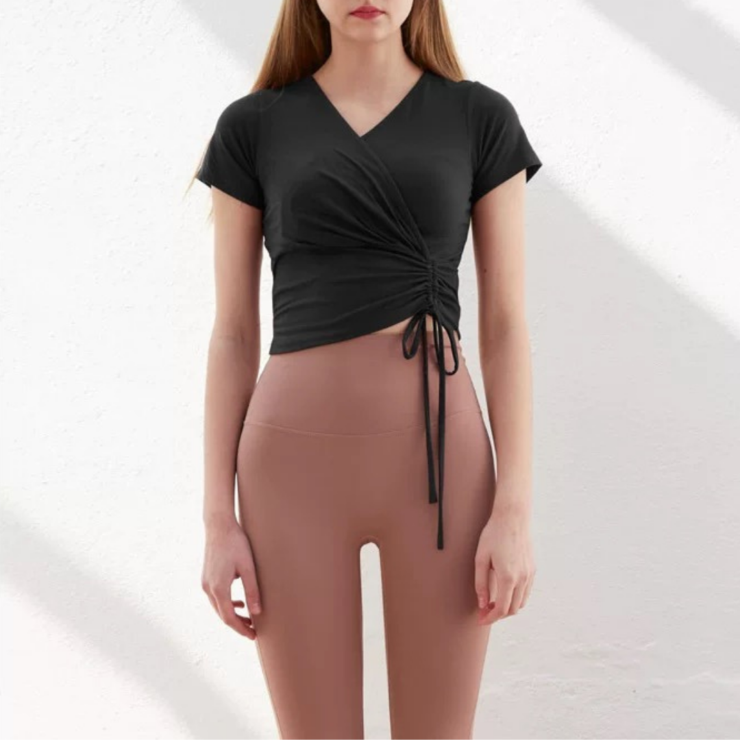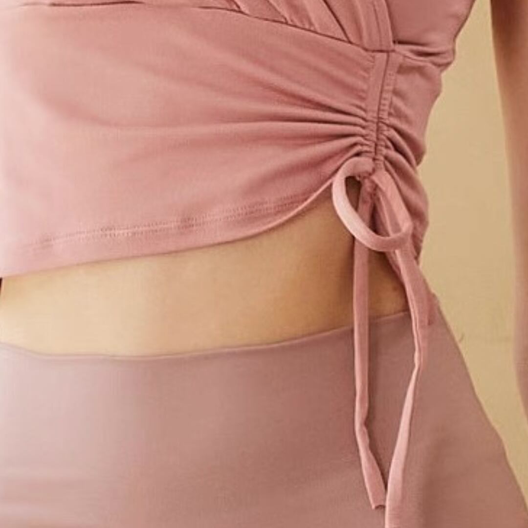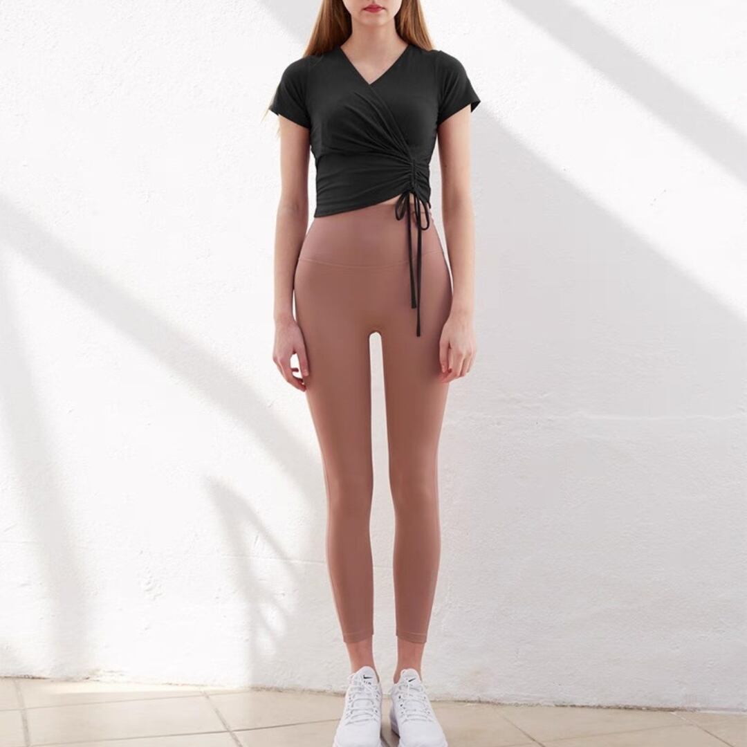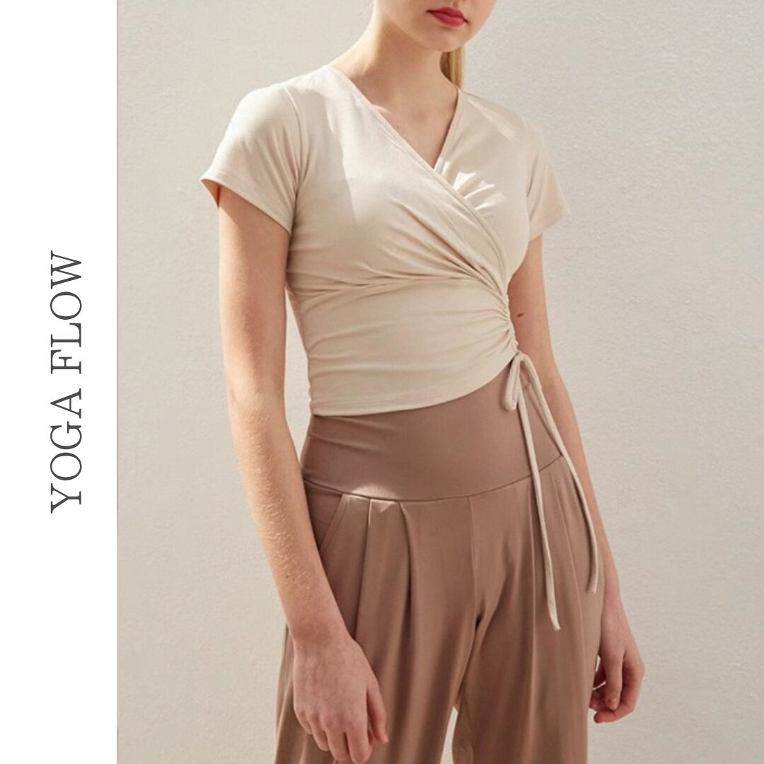 【商品管理番号】 F0142 【商品説明】 やわらかな生地感と女性らしいシルエットが魅力のラップトップスです。 ウエスト部分のギャザーとリボンがスタイルアップを演出し、体のラインをきれいに見せてくれます。 深めのVネックがデコルテをすっきり見せ、ヨガやピラティスだけでなくデイリーコーデにも活躍。 【サイズ】 【S】バスト:31cm/着丈:41cm/袖丈:14cm 【M】バスト:32.5cm/着丈:42cm /袖丈:14.5cm 【L】バスト:34cm/着丈:43cm /袖丈:15cm 【カラー】 オフホワイト ブラック ピンク 【素材】 ナイロン75%/ポリウレタン25%