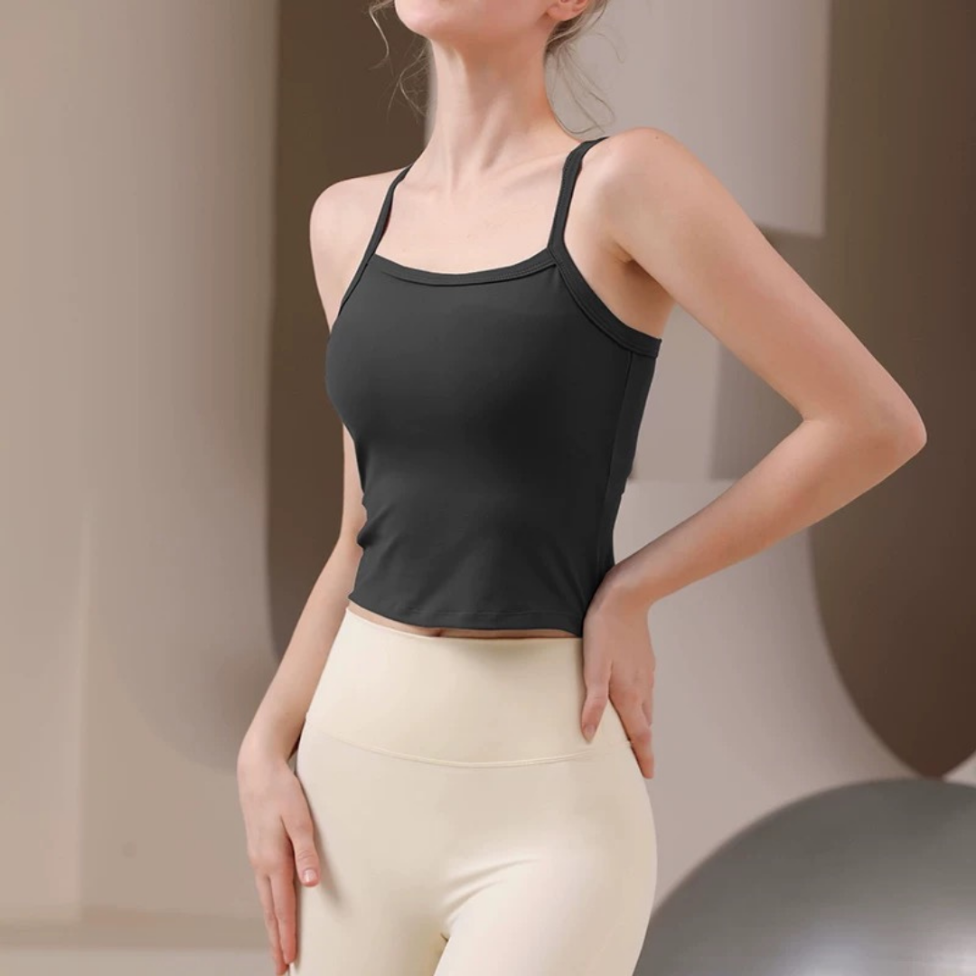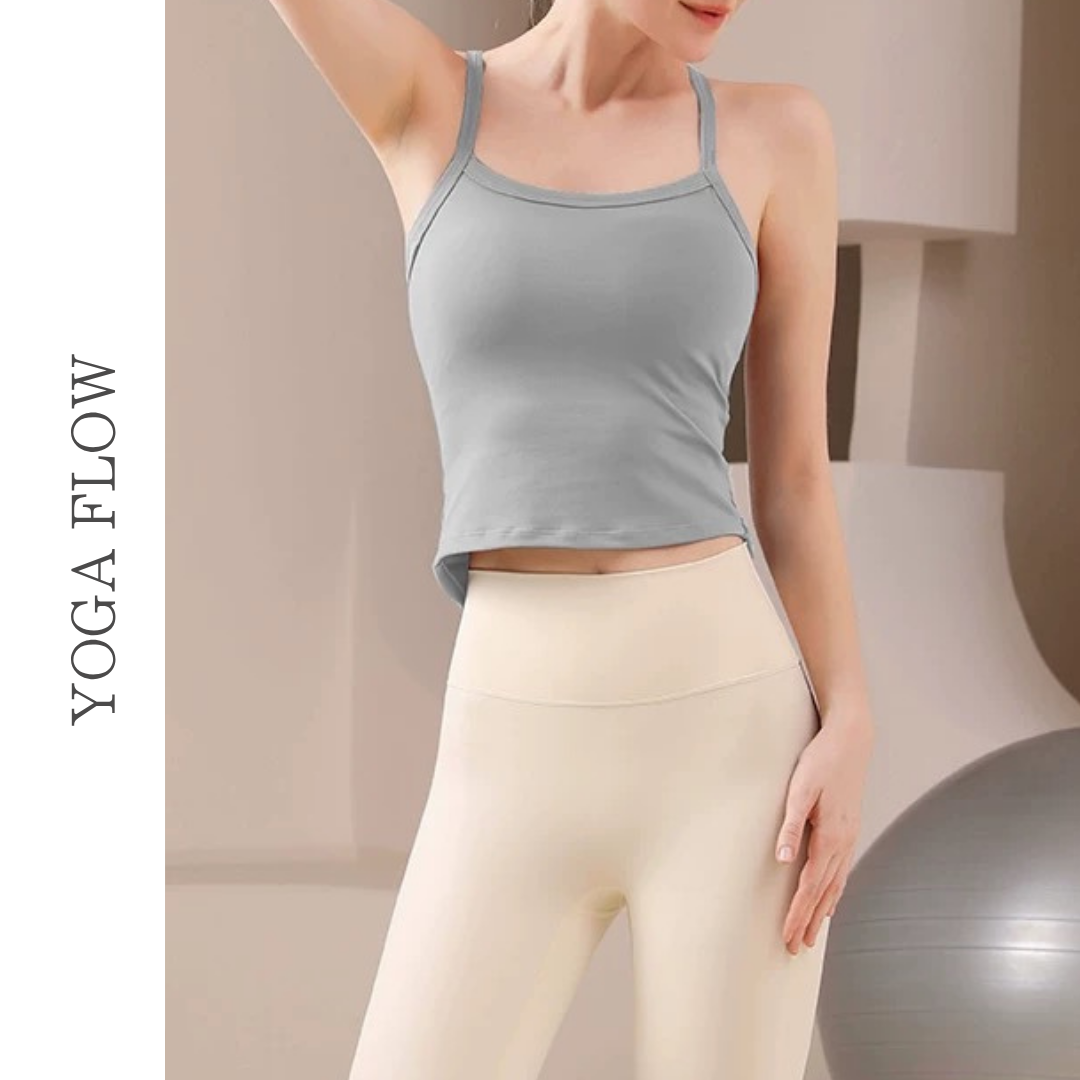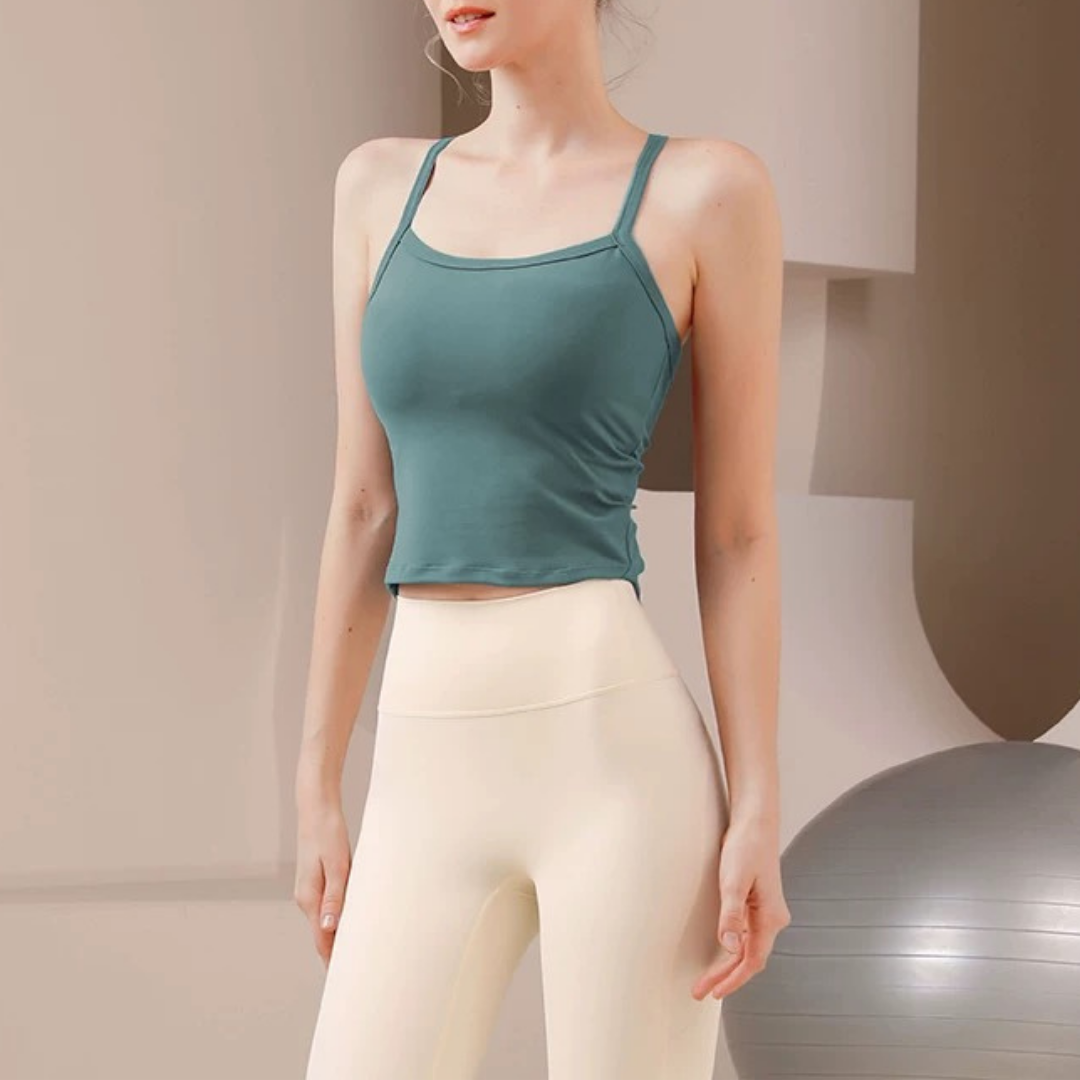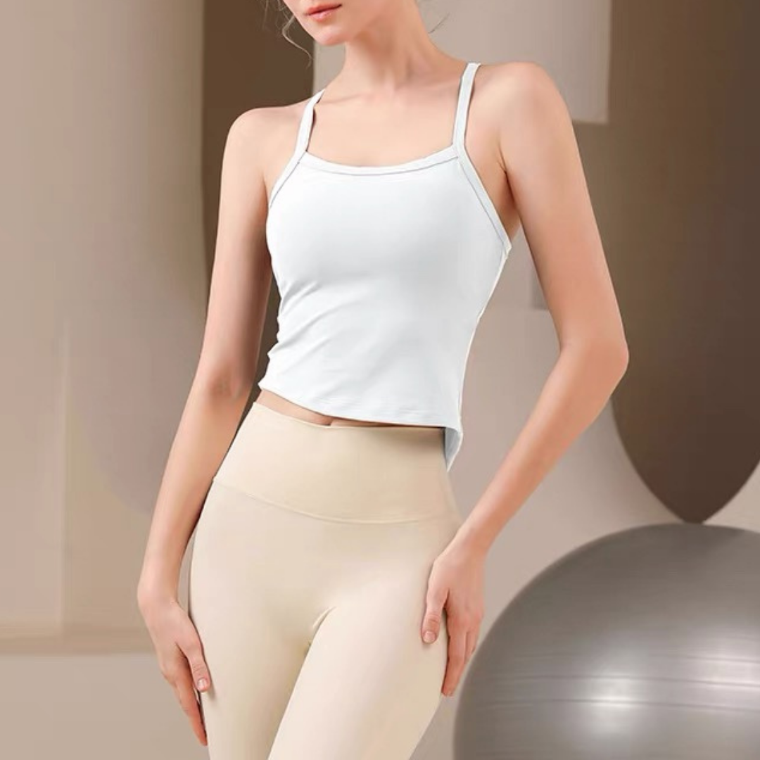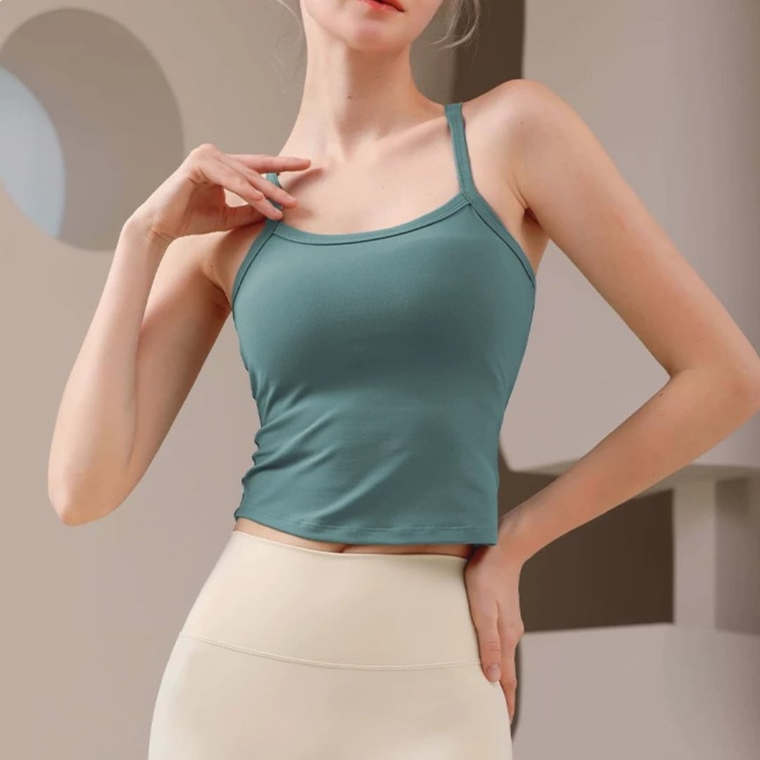 【商品管理番号】 F0146 【商品説明】 華奢なストラップとバックオープンのデザインが印象的なヨガトップ。 コンパクトな丈感でウエストラインをすっきり見せ、動くたびに女性らしいシルエットを演出。 一枚でもレイヤードでもバランスよく決まる、シンプルで洗練された1枚です。 【サイズ】 【S】バスト:66m/裾まわり:61cm/着丈:40cm 【M】バスト:69cm/裾まわり:64cm/着丈:41cm 【L】バスト:72cm/裾まわり:67cm/着丈:42cm 【カラー】 グレー ブラック ホワイト ブルー グリーン 【素材】 ナイロン75%/ポリウレタン25%